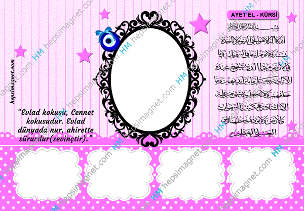 Pembe tonlarda Nazar boncuklu, şık çerçeveli buzdolabı magneti üzerinde arapça Ayet' El Kursi duası ve “Evlad kokusu, Cennet kokusudur. Evlad dünyada nur, ahirette sürurdur(sevinçtir).” yazısı bulunmaktadır.
