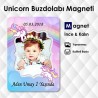 Kız bebek için magnet unicorn modeli isimli ve resimli dolap süsü bebeğinizin adı, doğum tarihi, yaşı gibi bilgilerinden hazırlanmaktadır.