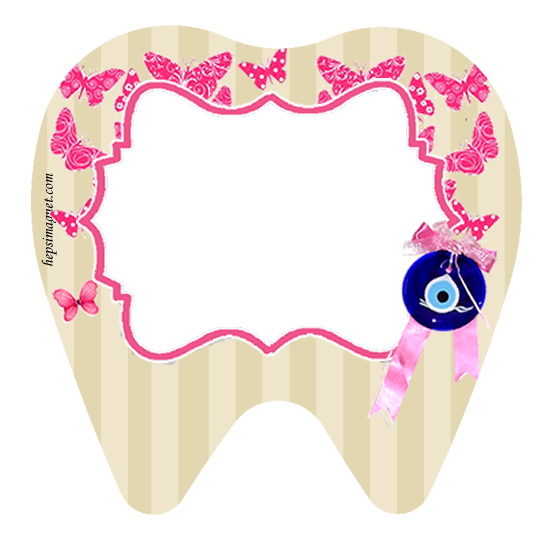 Kız bebekler için hazırlanmış diş şekilli kelebekli, nazar boncuklu magnetli doğum günü buzdolabı süsüdür.Arkası tamamen mıknatıs ile kaplı diş perisi tasarımlı dolap magneti üzerinde yer alan bilgileri değiştirerek bebeğnize özel olarak diş buğdayı, diş hediği,  ilk diş  hediyesi için hazırlatabilirsiniz.