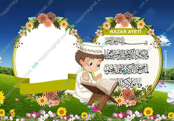 Bilgilerinizi ekledikten sonra Özelleştirmeyi Kaydet Butonuna basınız.Resimli erkekler için nazar ayetli Kur'an öğrendim magnet modellidir. Kur'an öğrendim magnetimiz güzel ve kalıcı bir hatıradır. Arkası mıknatıslı şık çerçeveli, çicekler ile süslenmiş magnet modelimizdir. Tasarım üzerindeki bilgileri değiştirerek kişiye özel resimli magnet olarak hazırlatabilirsiniz.